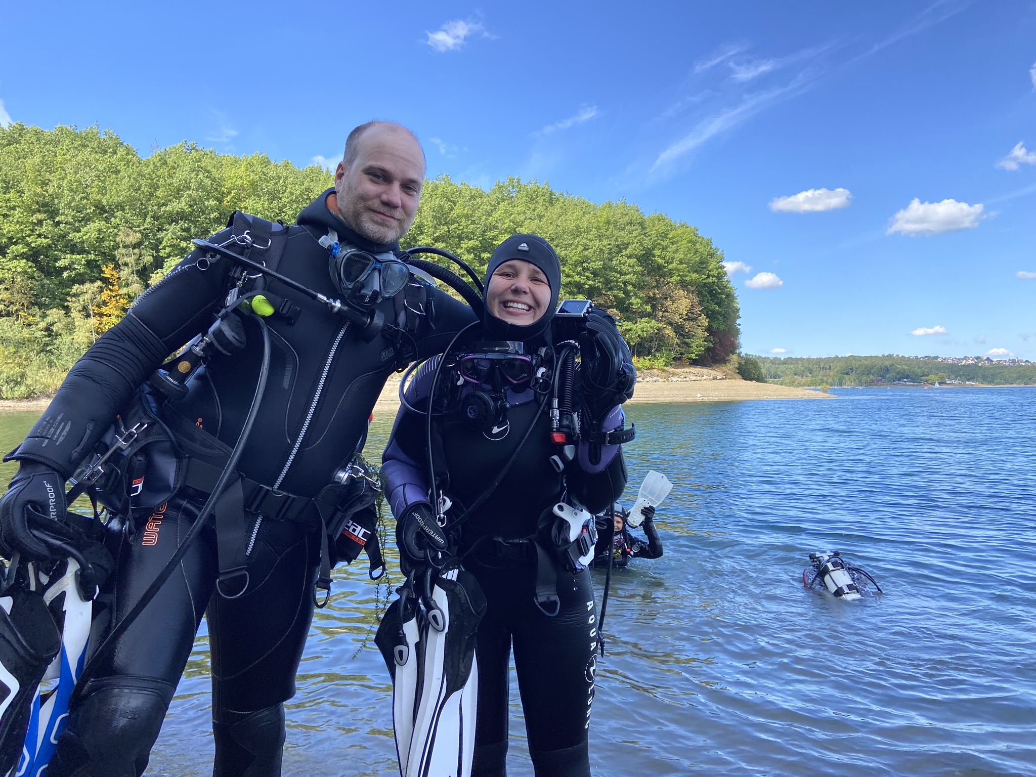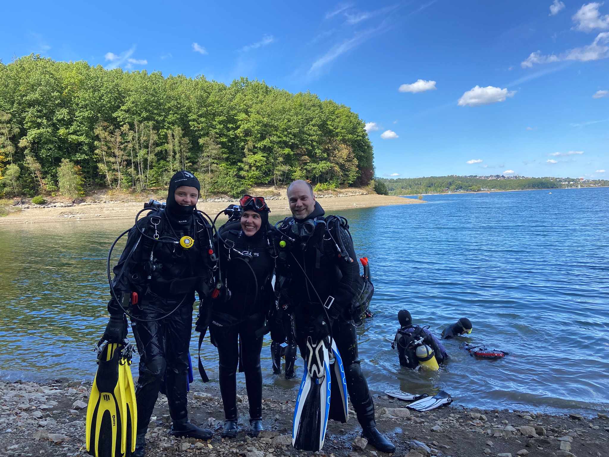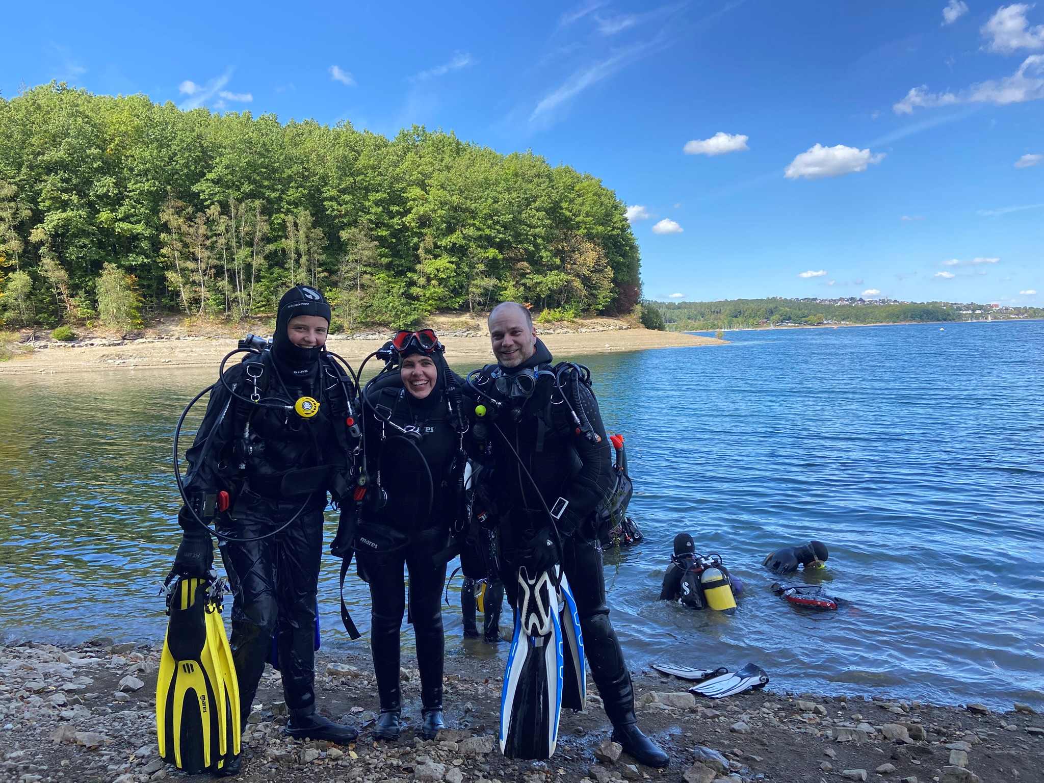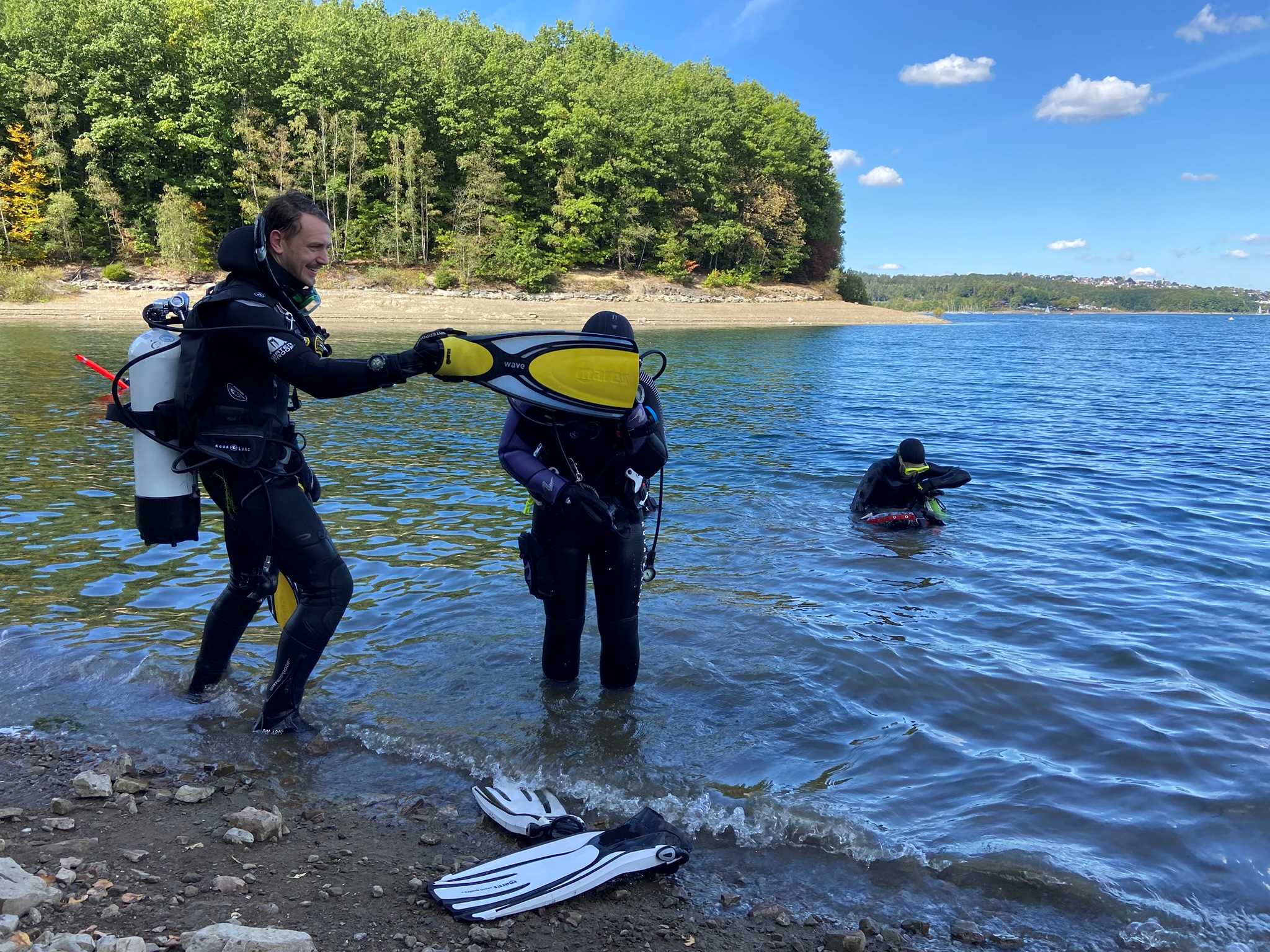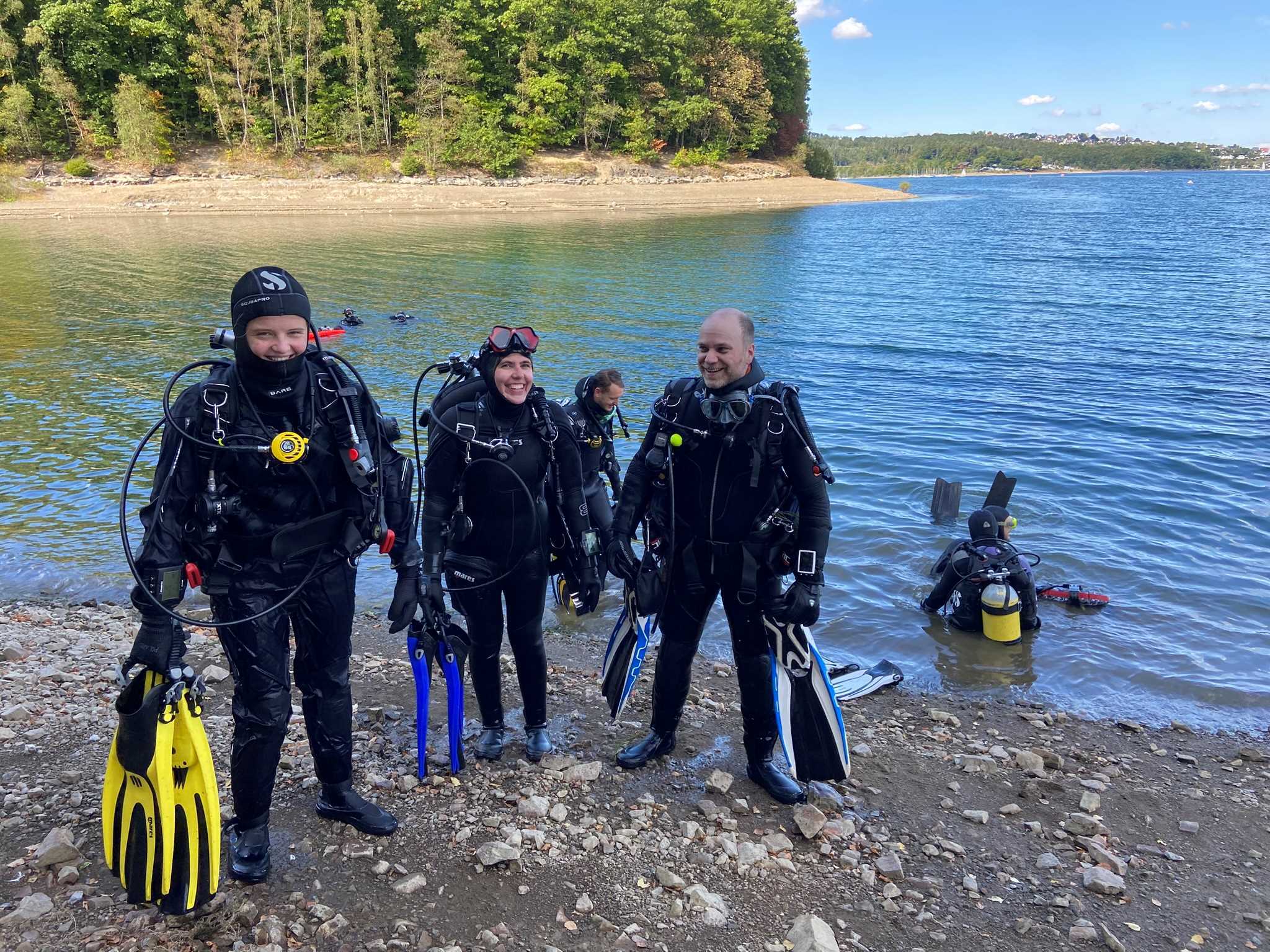 Sechs motivierte Anwärterinnen und Anwärter auf das DTSA 2* haben am Wochenende den praktischen Teil im Freigewässer begonnen. Auf dem Programm standen zunächst Apnoeübungen wie das Abtauchen auf 7,5 Meter sowie die Rettung eines Tauchers aus 5 Metern Tiefe.